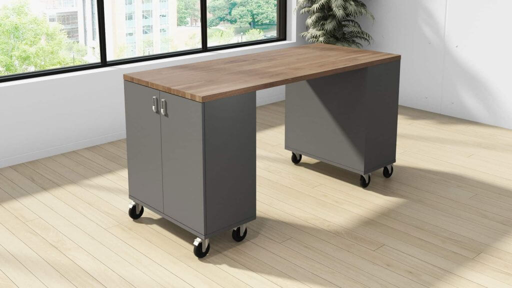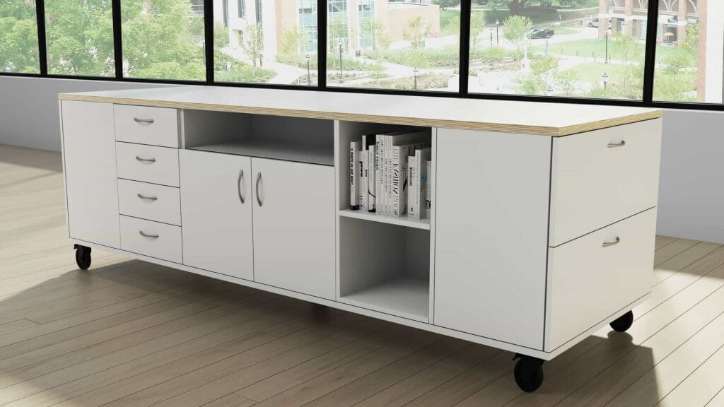 This modular platform from Deskmakers allows you to mix and match storage components to maximize workflow. You can specify fixed or mobile islands to maximize open space for multi-functional tasks. Catalina provides a standardized solution without the custom mill work price tag.